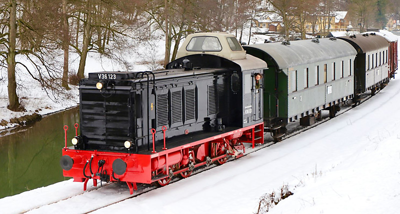 1985 gelangte diese Diesellokomotive der Baureihe V 36 zur DFS und vertritt damit eine Bauart, die in den 1950er Jahren regulär im Wiesenttal eingesetzt worden war. Die DFS – Lokomotive wurde 1939 von der Lokomotivfabrik Jung unter der Fabriknummer 8506 für die Deutsche Wehrmacht gebaut, die von 1937 bis 1945 ca. 370 Lokomotiven dieses Typs beschaffte. Die heutige DFS-Lok kam nach dem zweiten Weltkrieg zur Britischen Rheinarmee, wo sie im Raum Mönchengladbach als Nr. 36 235 (Inventarnummer) bis 1985 im Einsatz stand. Bei der DFS als V 36 235 bezeichnet, hat sie im Rahmen von Sonderfahrten auf verschiedenen fränkischen Nebenbahnen bereits dazu beigetragen, unsere Museumsbahn weiter bekannt zu machen. Auf der Wiesenttalbahn kommt sie vor den fahrplanmäßigen Dieselzügen der DFS zum Einsatz. Seit 1994 ist die Lokomotive mit einer Induktiven Zugsicherung (INDUSI) ausgerüstet.